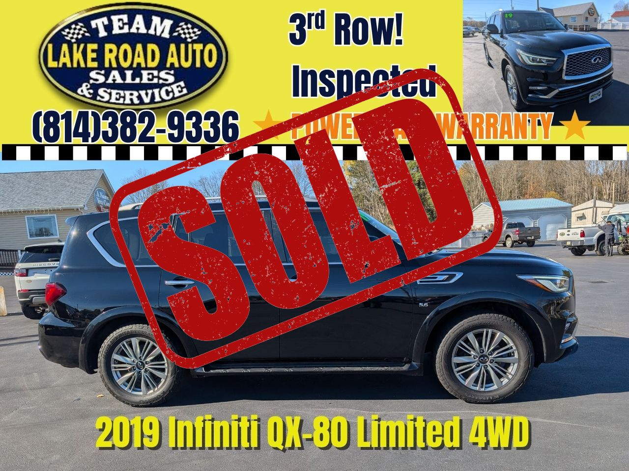 2019 INFINITI QX80 Limited 4WD — full-size luxury SUV with a burly 5.6L V8 and only 113,000 miles. This loaded Limited model blends bold presence with refined comfort: premium heated leather seats, heated steering wheel, power sunroof, power front seats and power-folding 3rd-row seats for effortless versatility. Safety and tech are top-tier — adaptive cruise control, navigation, Bluetooth, and a backup camera make every drive easier and more confident. Tastefully appointed interior, plenty of cargo space, and tow capability make this a perfect family hauler or weekend escape vehicle. Well maintained and ready to go — come see why the QX80 is luxury without compromise.
